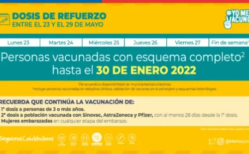 Además, pueden vacunarse con la dosis de refuerzo las mujeres embarazadas en cualquier etapa del embarazo, pueden ponerse la primera dosis las personas de 3 años o más y pueden ponerse la segunda dosis la población vacunada con Sinovac, AstraZeneca y Pfizer con al menos 28 días desde la primera dosis.