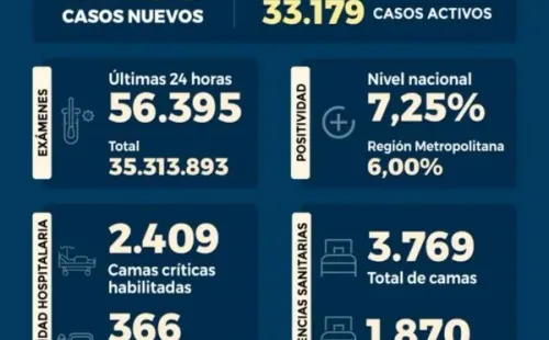 Se registraunapositividad de un 7,25% a nivel paísy de un 6% en laRegión Metropolitana,lamentando elfallecimiento de 65personasa causa del virus.Destacando queloscasos activos son 33.179al día de hoy.