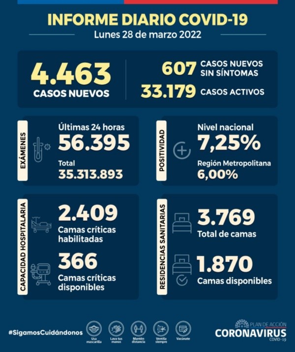 ¿Cuántos casos de Covid-19 hay este lunes 28 de marzoen Chile?