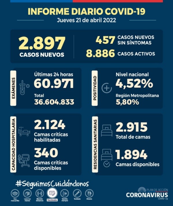 Hace pocos minutoselMinisterio de Salud (Minsal) publicóel reporte diario donde seregistraron2.897 casos nuevos de Covid-19 en las últimas 24 horas de los cuales1.720 sonpersonas sintomáticas y 457 no presentan síntomas.