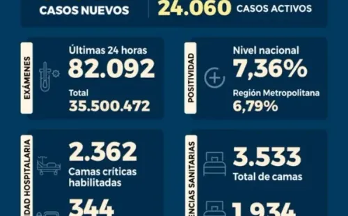 De esta manera, la positividad para las últimas 24 horas a nivel país es de 7,36% y en la Región Metropolitana es de 6,79%.