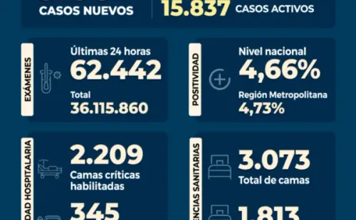 Se registraunapositividad de un 4,66% a nivel paísy de un 4,73% en laRegión Metropolitana,lamentando elfallecimiento de 44personasa causa del virus.Destacando queloscasos activos son 15.837casosal día de hoy.