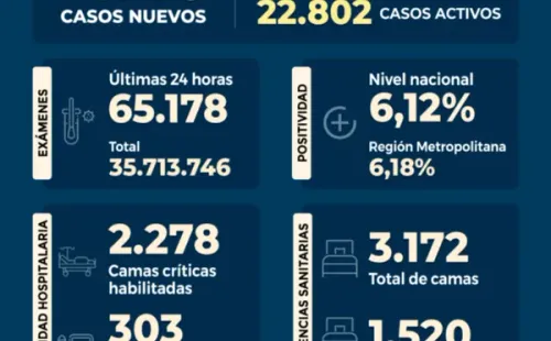 Se registraunapositividad de un 6,12% a nivel paísy de un 6,18% en laRegión Metropolitana,lamentando elfallecimiento de 61 personasa causa del virus.Destacando queloscasos activos son22.802al día de hoy.