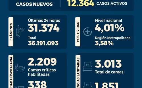 Se registraunapositividad de un 4,01% a nivel paísy de un 3,58% en laRegión Metropolitana,lamentando elfallecimiento de 13personasa causa del virus.Destacando queloscasos activos son 12.364 casosal día de hoy.