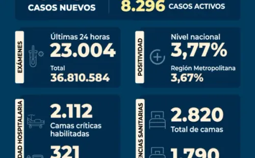 Se registraunapositividad de un 3,77% a nivel paísy de un 3,67% en laRegión Metropolitana,lamentando elfallecimiento de 11personaa causa del virus.Destacando queloscasos activos son 8.296casosal día de hoy.