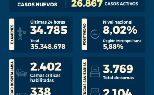Se registraunapositividad de un 8,02% a nivel paísy de un 5,88% en laRegión Metropolitana,lamentando elfallecimiento de 18personasa causa del virus.Destacando queloscasos activos son 26.867al día de hoy.