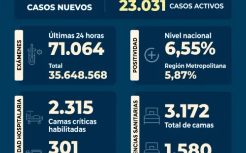 Se registraunapositividad de un 6,55% a nivel paísy de un 5,87% en laRegión Metropolitana,lamentando elfallecimiento de 52personasa causa del virus.Destacando queloscasos activos son23.031al día de hoy.