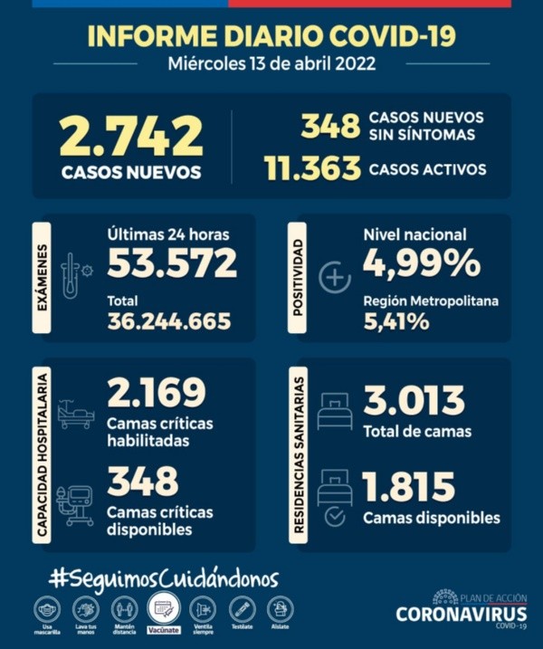 Hace pocos minutoselMinisterio de Salud (Minsal) publicó su reporte diario, donde se registran2.742 casos nuevos de Covid-19 en las últimas 24 horasde los cuales1.664 corresponden a personas sintomáticas y 348 no presentan síntomas y11.363 casos activos.