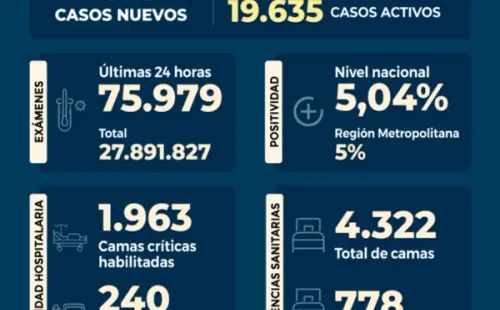 Se registróunapositividad de un 5,04%a nivel paísy de un 5% en la Región Metropolitana,lamentando elfallecimiento de 21personasa causa del virus.Destacando queloscasos activos son 19.635al día de hoy.