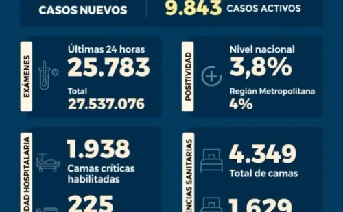 Se registróunapositividad de un 3,8% a nivel paísy de un 4% en la Región Metropolitana,lamentando elfallecimiento de 22personasa causa del virus.Destacando queloscasos activos son 9.843al día de hoy.