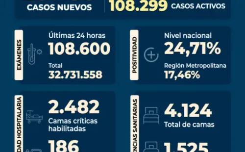 Se registraunapositividad de un 24,71%a nivel paísy de un 17,46% en la Región Metropolitana,lamentando elfallecimiento de 124personasa causa del virus.Destacando queloscasos activos son 108.299al día de hoy.