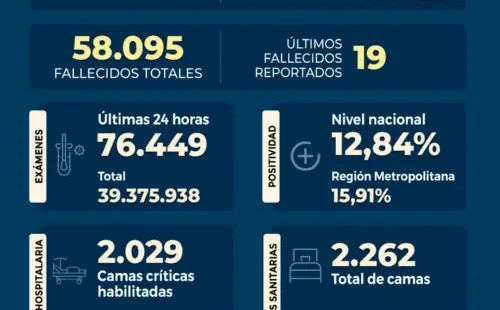 Se registraunapositividad de un 12,84% a nivel paísy de un 15,91% en laRegión Metropolitana, lamentando elfallecimiento de 19personaa causa del virus.Destacando queloscasos activos son 47.451 al día de hoy.