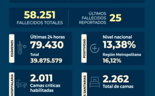 Se registraunapositividad de un 13,38% a nivel paísy de un 16,12% en laRegión Metropolitana, lamentando elfallecimiento de 25personaa causa del virus.Destacando queloscasos activos son 49.383al día de hoy.
