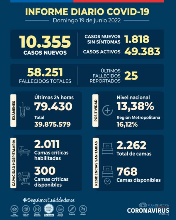 Unnuevoinformesobre laactualidad de lapandemiaen Chile,se publicóeste 19de juniopor parte delMinisterio de Saludqueinformó unaumento en loscasos deCovid,con 826másque el domingoanteriorregistrando unaumento en los contagios.