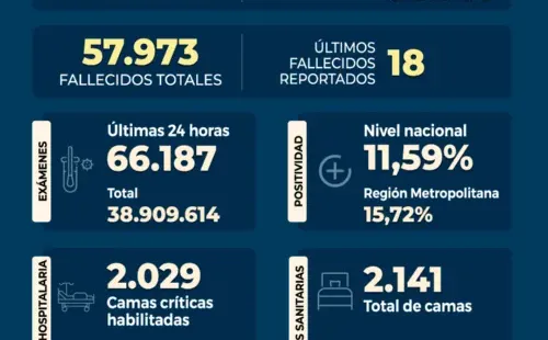Se registraunapositividad de un 11,59% a nivel paísy de un 15,72% en laRegión Metropolitana, lamentando elfallecimiento de 18personaa causa del virus.Destacando queloscasos activos son 36.959 casosal día de hoy.