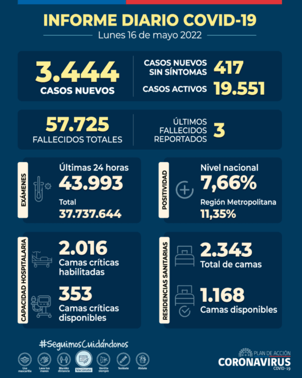 Unnuevoinformesobre laactualidad de lapandemiaen Chile,se publicóeste 16 de mayopor parte delMinisterio de Saludqueinformó un leve aumento en loscasos deCovid,con 1.472másque el lunes anteriorregistrando nuevamente un aumento en los contagios.