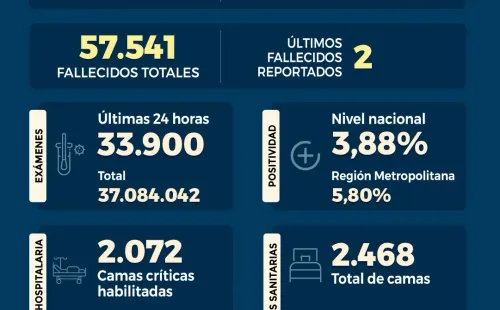 Se registraunapositividad de un 3,88% a nivel paísy de un 5,80% en laRegión Metropolitana,lamentando elfallecimiento de 2personaa causa del virus.Destacando queloscasos activos son 9.467casosal día de hoy.