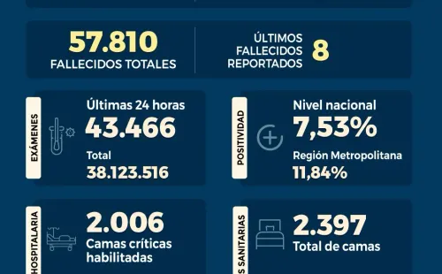 Se registraunapositividad de un 7,53% a nivel paísy de un 11,84% en laRegión Metropolitana,lamentando elfallecimiento de 8personaa causa del virus.Destacando queloscasos activos son 26.117 casosal día de hoy.