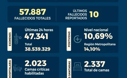 Se registraunapositividad de un 10,69% a nivel paísy de un 14,10% en laRegión Metropolitana, lamentando elfallecimiento de 10personaa causa del virus.Destacando queloscasos activos son 33.886casosal día de hoy.