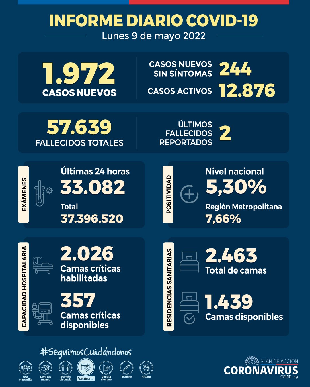Unnuevoinformesobre laactualidad de lapandemiaen Chile,se publicóeste 9de mayopor parte delMinisterio de Saludqueinformó un leve aumento en loscasos deCovid,con 491másque el lunesanteriorregistrando nuevamente un aumento en los casos de contagios.