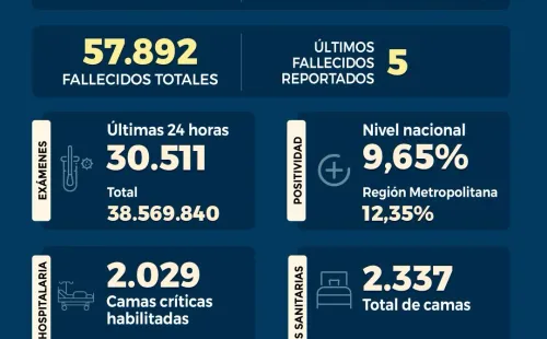 Se registraunapositividad de un 9,65% a nivel paísy de un 12,35% en laRegión Metropolitana, lamentando elfallecimiento de 5personaa causa del virus.Destacando queloscasos activos son 29.222casosal día de hoy.