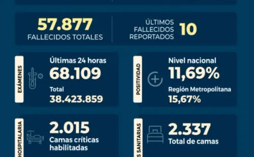 Se registraunapositividad de un 11,69% a nivel paísy de un 15,67% en laRegión Metropolitana,lamentando elfallecimiento de 10 personaa causa del virus.Destacando queloscasos activos son 31.341casosal día de hoy.