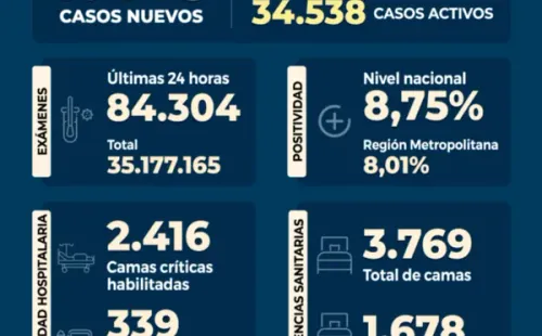 Se registraunapositividad de un 8,75% a nivel paísy de un 8,01% en laRegión Metropolitana,lamentando elfallecimiento de 76personasa causa del virus.Destacando queloscasos activos son 34.538al día de hoy.