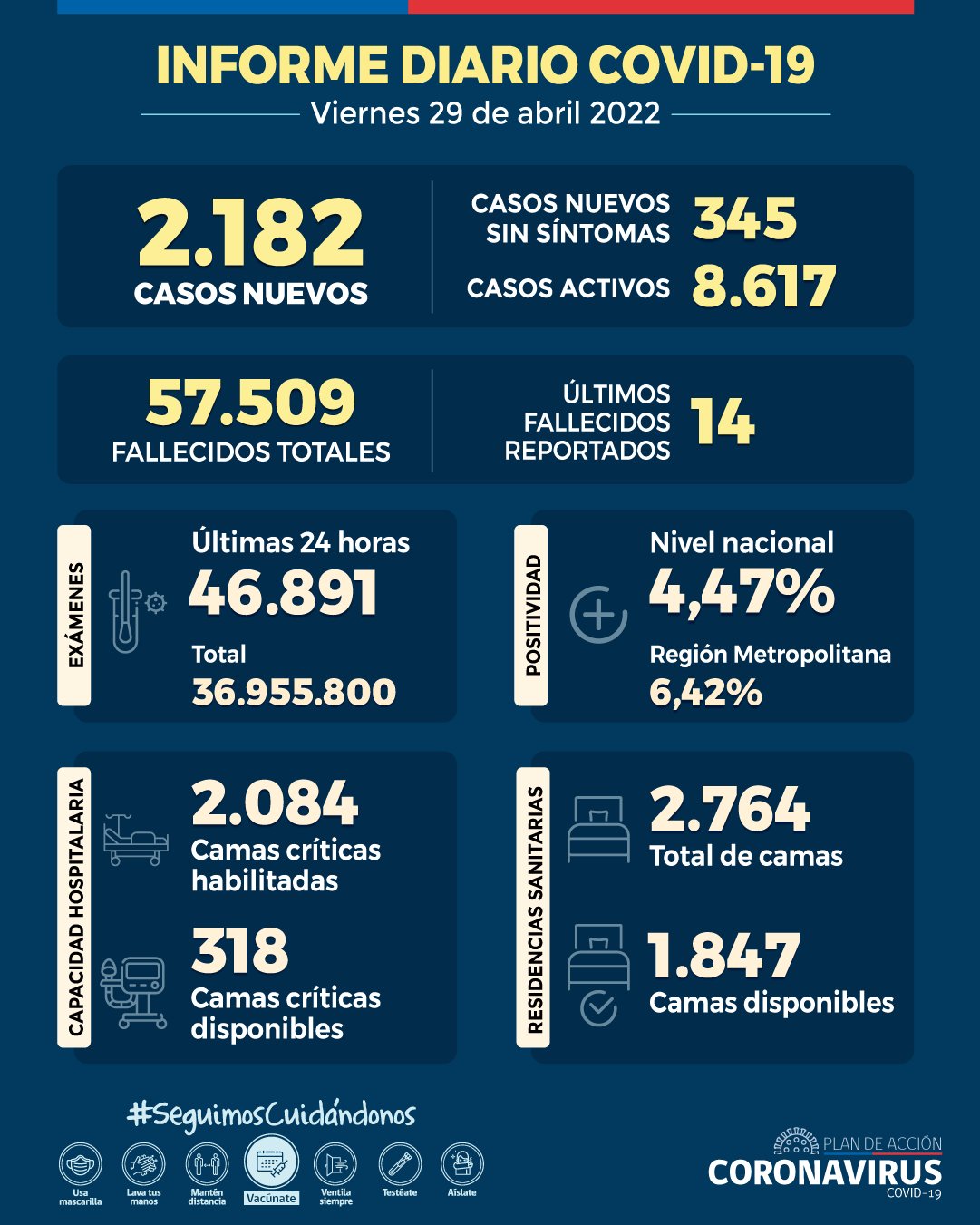 Unnuevoinformesobre laactualidad de lapandemiaen Chile,se publicóeste 29de abril por parte delMinisterio de Saludqueinformó disminución en loscasos deCovid,con 517menos que el viernesanteriorregistrando nuevamente una bajalos casos de contagios.