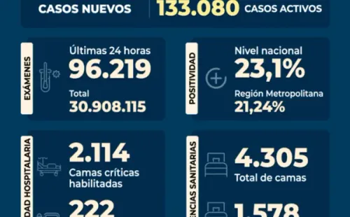 Se registróunapositividad de un 23,1%a nivel paísy de un 21,24% en la Región Metropolitana,lamentando elfallecimiento de 27personasa causa del virus.Destacando queloscasos activos son 133.080al día de hoy.