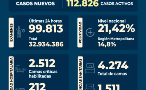 Se registraunapositividad de un 21,42%a nivel paísy de un 14,8% en laRegión Metropolitana,lamentando elfallecimiento de 130personasa causa del virus.Destacando queloscasos activos son 112.826 al día de hoy.