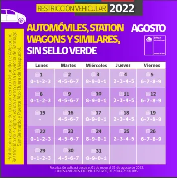 La restricción vehicular es una medida impulsada por el Ministerio del Medio Ambiente que tiene como objetivo aliviar el tráfico en la Región Metropolitana y evitar la contaminación ambiental por la emisión de gases tóxicos que dejan los vehículos y esta medida rige desde el 1 de mayo al 31 de agosto.