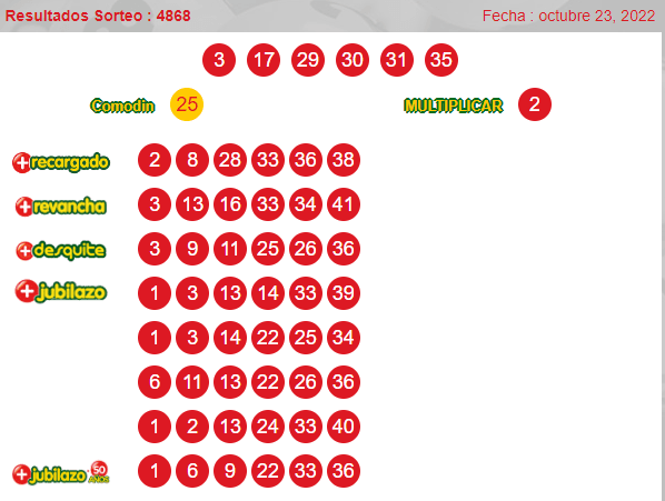Resultados del Loto:Números ganadores sorteo 4868domingo 23de octubre