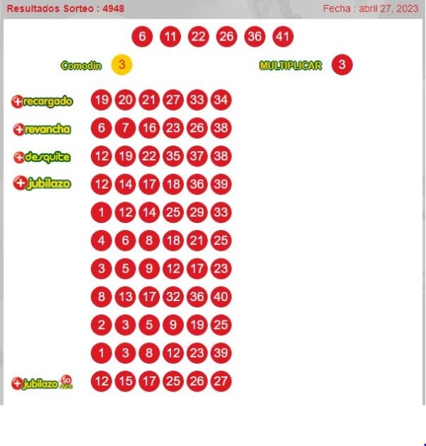 Números ganadores del loto 4948 jueves 27 de abril