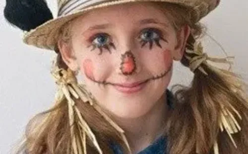 Similar al maquillaje de una muñeca el maquillaje de espantapájaros requiere que solo realices diferentes dibujos para recrear tela, para dibujar necesitarás pintura de color negro y naranjo.