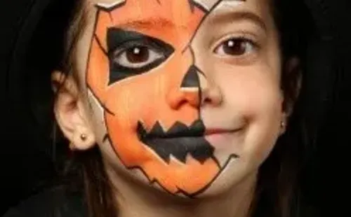 Algo mucho más simple para realizar es el de calabaza, solo necesitarás pintura de cara color naranjo, negro y blanco. Puedes hacerlo solo en la mitad de la cara o en toda la cara realizando los triángulos en los ojos y la forma de la boca con color negro.