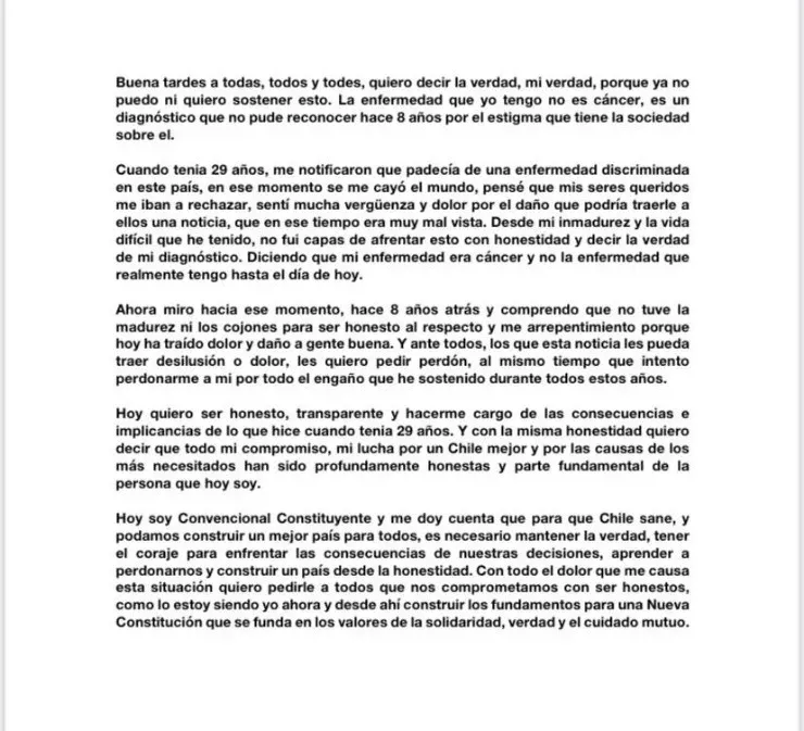 “Quiero decir la verdad, mi verdad. Porque ya no quiero ni puedo sostener esto. La enfermedad que yo tengo no es cáncer, es un diagnóstico que no pude reconocer hace 8 años (…) Con todo el dolor que me causa esta situación quiero pedirle a todos que nos comprometamos con ser honestos, como lo estoy siendo yo ahora y desde ahí constriur los fundamentos para una Nueva Constitución…”