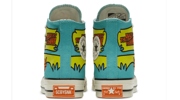 El primero es azul y verde, adornado con gráficas florales naranjas, que transmiten la estética de la reconocida furgoneta, “Máquina del Misterio”. También, se ha modificado la tradicional etiqueta de Converse en el talón, donde ahora se lee “SCBYSNK”, abreviación de “Scooby Snack”. Por su parte, el revestimiento interior presenta dibujos en blanco y negro con los personajes.