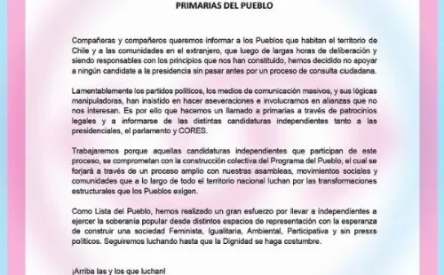 Mediante un comunicado, La Lista del Pueblo señaló que “luego de largas horas de deliberación y siendo responsables con los principios que nos han constituido, hemos decidido no apoyar a ningún candidate a la presidencia sin pasar antes por un proceso de consulta ciudadana”.