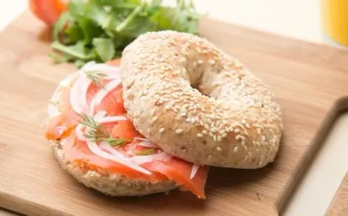 Tuesta unos bagels y úntalos con queso crema. Agrega láminas de salmón ahumado y opcionalmenterodajas de pepino y cebolla.