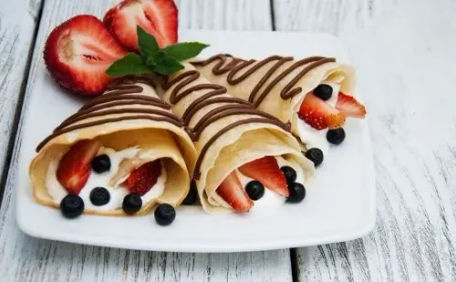 Haz crepes delgados y rellénalos con una mezcla de queso crema y azúcar. Sirve con una salsa casera de frutos rojos hecha con frutillas arándanos y frambuesas.