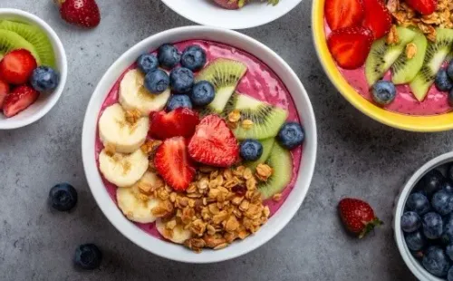 Prepara un smoothie espeso utilizando tu combinación de frutas favoritas, como plátanos, arándanos y mango. Sirve en un pocillo y decora con granola, semillas de chía y frutas frescas adicionales.
