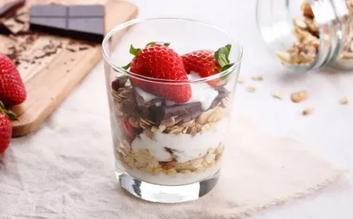 Alterna capas de yogur griego, granola casera y frutas frescas en un vaso. Puedes utilizar frutillas, mango o kiwi para darle un toque colorido.