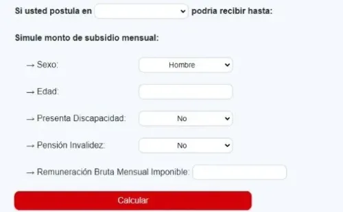 Selecciona el mes en que postulas, tu sexo y edad. Luego, marca si tienes una discapacidad o no y si recibes Pensión de Invalidez. A continuación, escribe tu Remuneración Bruta Mensual Imponible y haz clic en “Calcular”.