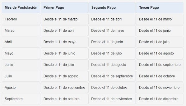 Los pagos comienzan a recibirse a contar del día 11 del mes siguiente a la postulación. Por ejemplo, si postulaste el 15 de mayo, el primer pago se realiza a partir del 11 de junio. Revisa a continuación el calendario de pagos: