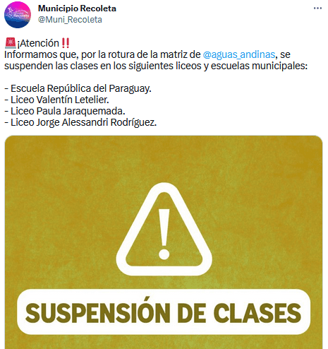 Un corte de agua obligó a suspender las clases en distintos establecimientos educacionales en la capital. El corte de suministro se inició al mediodía de esta jornada de lunes en cuatro comunas: Recoleta, Renca, Independencia y Quilicura, las cuales permanecerán sin suministro hasta el mediodía de mañana martes.