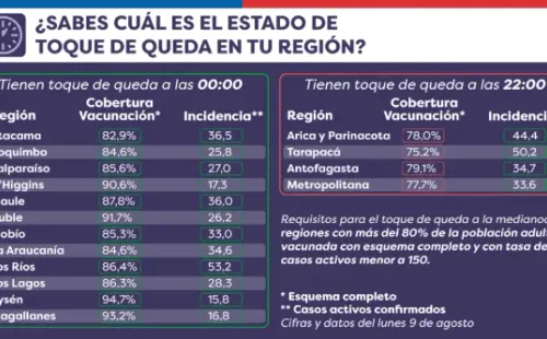 Son cuatro regiones del país las que aún tienen toque de queda desde las 22:00 PM: Arica y Parinacota, Tarapacá, Antofagasta y Metropolitana, las cuales cumplen solo con el indicador de incidencia, no así el de población vacunada.