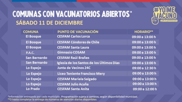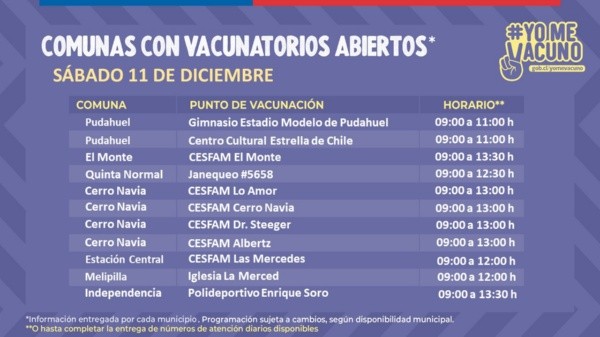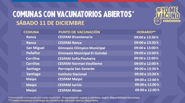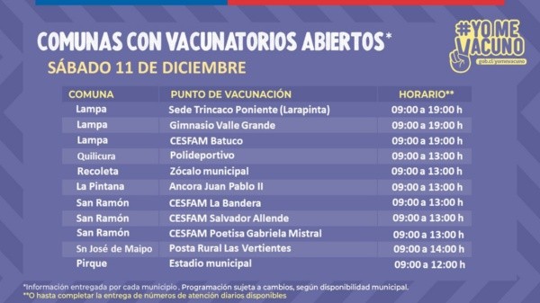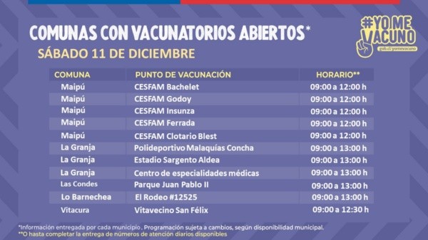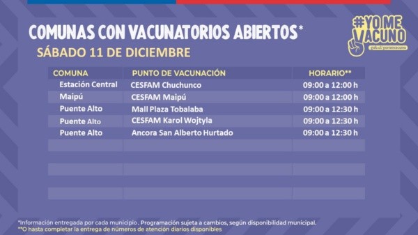 Este sábado 11 de diciembre estarán disponibles decenas de vacunatorios en diversas comunas de la Región Metropolitana.Los centros atenderán desde las 9.00 horas, con distintos horarios de término, dependiendo del centro de vacunación.