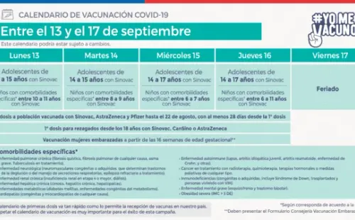 Este lunes 13 de septiembre comienza el proceso de vacunación para adolescentes de 14 y 15 años, y niños con comorbilidades entre 10 y 11 años.