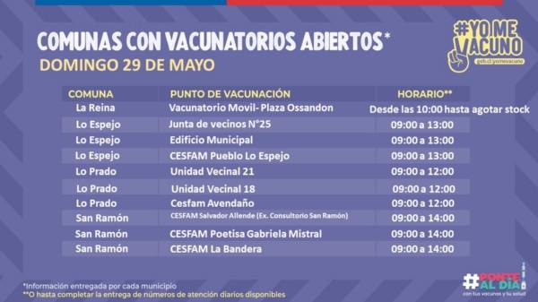 Según lo informado por la Seremi de Salud de la Región Metropolitana, este domingo 29 de mayo estarán abiertos los siguientes vacunatorios: