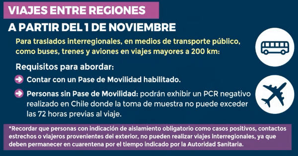 Las medidas sanitarias rigen para todas las personas desde los 12 años en adelante para viajes de 200 kilómetros o más de distancia, ya sea vía terrestre por buses y trenes, o por vía aérea; con las siguientes estipulaciones: